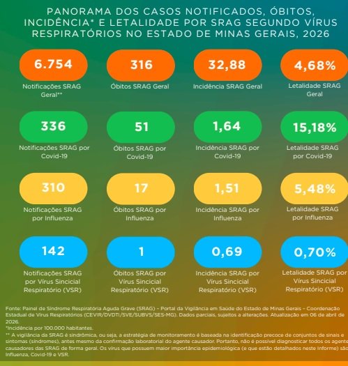 Minas Gerais registrou o índice alarmante de 6.754 casos de Síndrome Respiratória Aguda Grave (SRAG) no período de janeiro a abril de 2026. A condição, que representa a evolução mais severa de síndromes gripais, pode causar comprometimento respiratório significativo e levar à hospitalização, especialmente entre os grupos mais vulneráveis.