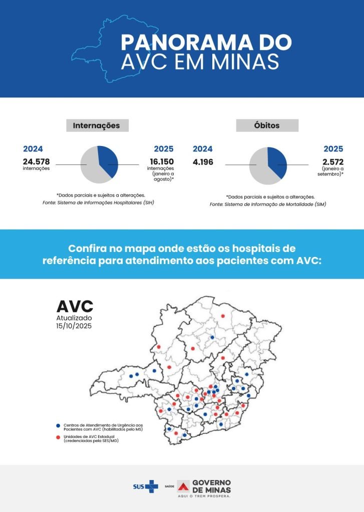 Em 2024, o AVC foi a sétima maior causa de morte em Minas, com 4.196 óbitos e média de 11 por dia. Com a ampliação dos centros, a mortalidade intra-hospitalar caiu de 16,5% em 2021 para 12% em 2024. O resultado decorre da maior capilaridade da rede, da tomografia em tempo oportuno, do uso do medicamento trombolítico e do treinamento das equipes de saúde.