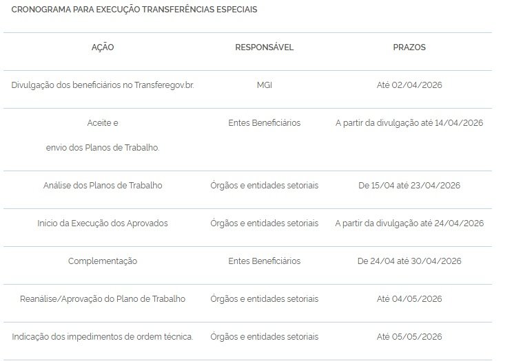 O cronograma acima se aplica para todas as emendas individuais na modalidade de transferências especiais, exercício 2026, executadas no Transferegov.br.