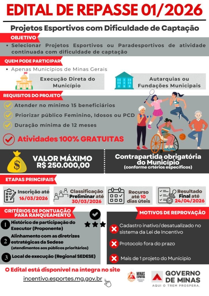 Com o objetivo de contribuir para que os municípios possam captar mais recursos para as políticas de estímulo ao esporte, a Associação Mineira de Municípios (AMM) inaugurou o Departamento de Esportes em 2015. A missão é auxiliar os municípios na captação de recursos estaduais e federais. Muitas prefeituras não têm técnicos específicos para estas políticas, por isso, a AMM se prontifica a fazer parcerias para apoiá-los.