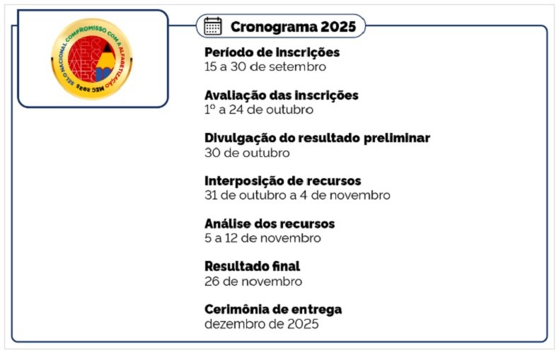 O Ministério da Educação (MEC) publicou, nesta segunda-feira, 25 de agosto, o Edital MEC nº 10/2025, que torna pública a 2ª Edição do Selo Nacional Compromisso com a Alfabetização. A iniciativa faz parte do Compromisso Nacional Criança Alfabetizada (CNCA) e busca reconhecer os esforços de estados, municípios e do Distrito Federal para a promoção da alfabetização na idade certa.