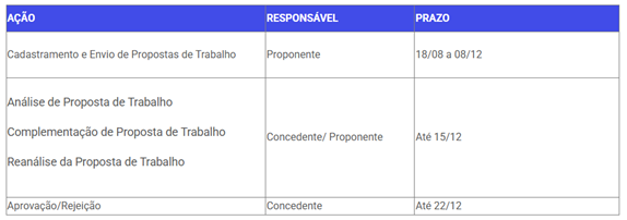 A primeira tabela é referente ao ciclo principal, no qual o cadastro e envio das propostas de trabalho já está aberto desde 18 de agosto e encerra dia 8 de dezembro . A fase de análise, complementação e reanálise das propostas vai até dia 15 de dezembro.