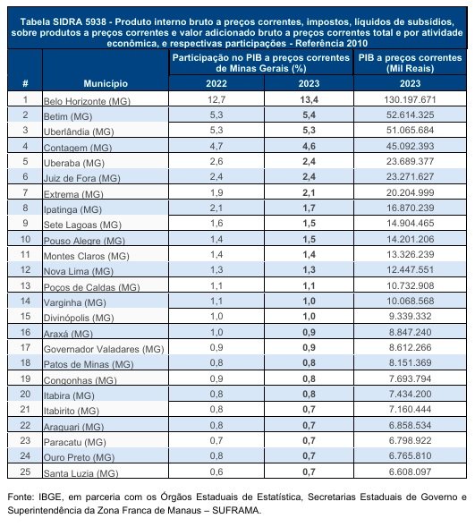 Pesquisa do Instituto Brasileiro de Geografia e Estatística (IBGE), publicada nesta sexta-feira (19/12), mostra que, em 2023, o Produto Interno Bruto (PIB) a preços correntes de Minas Gerais foi de R$ 972 bilhões, o que representava 8,9% do PIB do Brasil. Dos 853 municípios mineiros, 25 concentram mais da metade do PIB do estado. Confira a tabela abaixo.