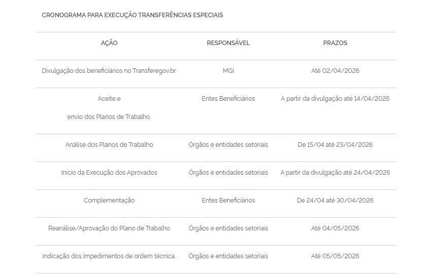 – O cronograma acima se aplica para todas as emendas individuais na modalidade de transferências especiais, exercício 2026, executadas no Transferegov.br.